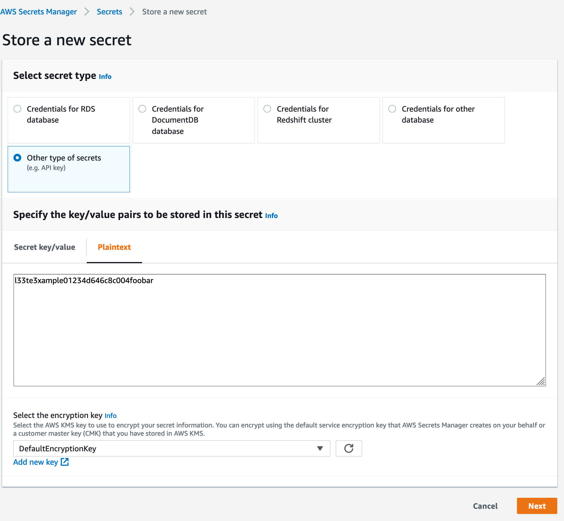 Choose Other types of secrets, then click on Plaintext, then paste the value of your PAT in the text field.