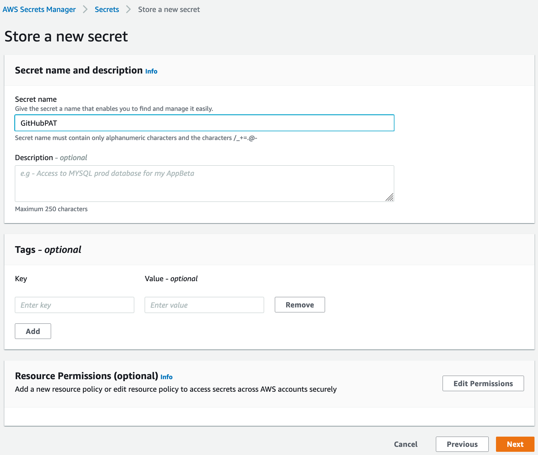 Choose a name for the secret (we’ve chosen GitHubPAT here), then click Next through the remaining screens and save the secret. Once the secret is created, you’ll find it in the list of secrets. If you click on the secret, you’ll see the secret ARN in the fields.